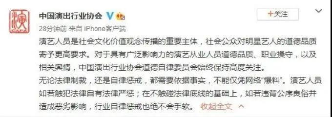 7月19日,中国演出行业协会官方微博发声: