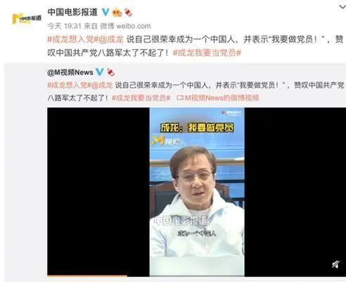 “我很荣幸成为一个中国人,但是我也很羡慕你们是党员。”今日,电影频道@中国电影报道微博分享了一则电影人成龙的视频片段,成龙感慨,“我要做党员。”