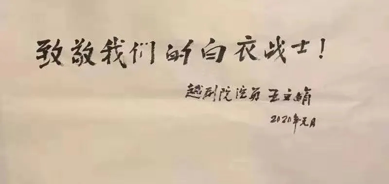 2020年疫情期间,王文娟老师向党组织捐出一万元善款,并坚持题写了“致敬我们的白衣战士”,为抗疫一线的医护人员鼓气加油!